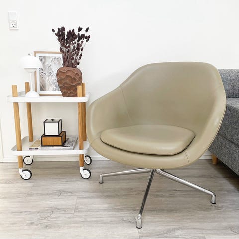 Hay stol med beige læder. Den har desværre en del ridser pga kat. Ny pris inkl. ekstra sidepude ca.15.000