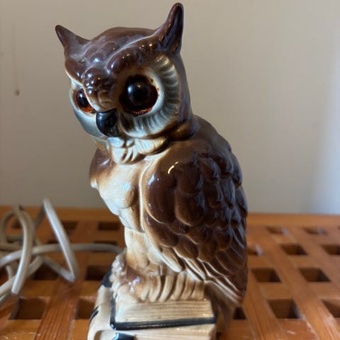 Ugle på bog. H. 18,5 cm. Lyset virker men skal have ny pære