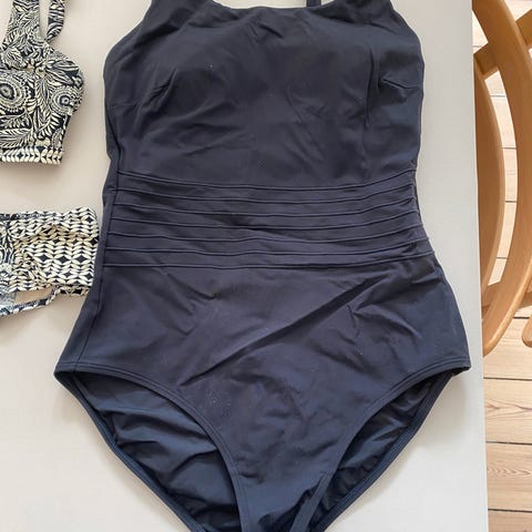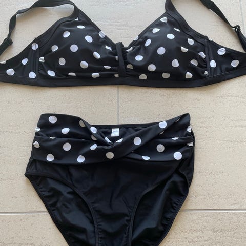 Sort bund med hvidt mønster. Med lommer til proteser. Bemærk jeg har både bikini og badedragt til salg