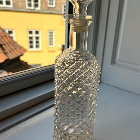 Glaskaraffel ubrugt - ny uden prismærke. Højde 19 cm. Fint dekoreret med blomsterranker. Købt i Jydepotten i Odense. Kan også afhentes Kbh. Ø.