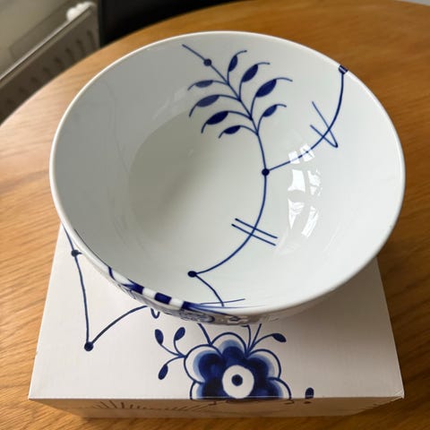 Royal Copenhagen Blå Mega Riflet skål 310 cl. 24 cm. Skålen er som ny - har kun stået i et skab. Nypris 1499,- Jeg har muligvis æsken et sted, hvis den ønskes med.
