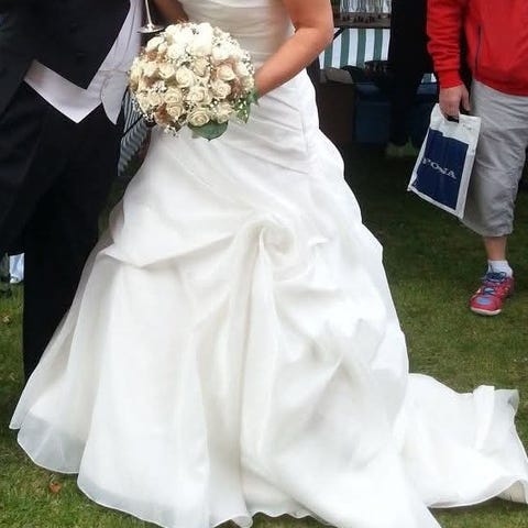 Brudenkjolen er 2 del, nederdelen mål er 114 cm foran og 163 cm bag på, fra hoften. Overdelen målet fra bryst til hofte 30 cm.