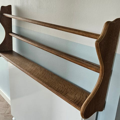 Gammel solid tallerkenrække med hylde i træ. Trænger til at blive malet eller slebet og sælges derfor billigt.
