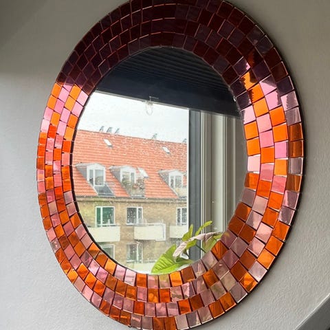 Rundt spejl med spejl mosaik kant. Yderdiameter er 44 cm. Selve spejlet 27 cm.