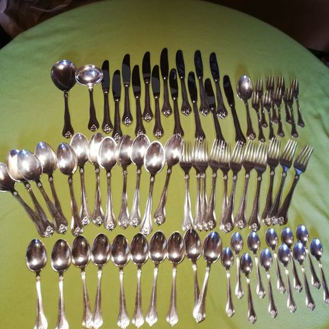 10 kagegafler a kr 32, 4 pålægsgafler a kr 34, 12 theskeer samlet kr 96.