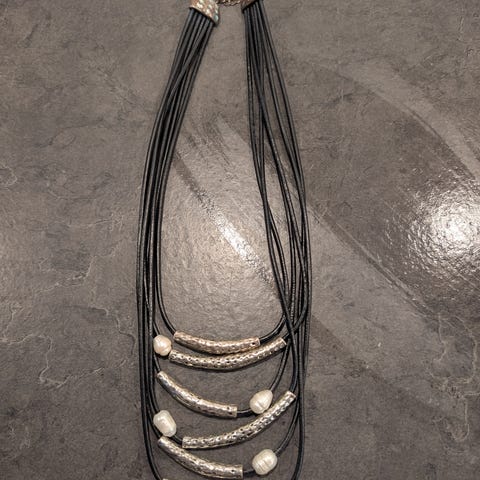 Halskæde med læder, dekoreret med firkantet glasperler ( længde ca. 48 cm.)