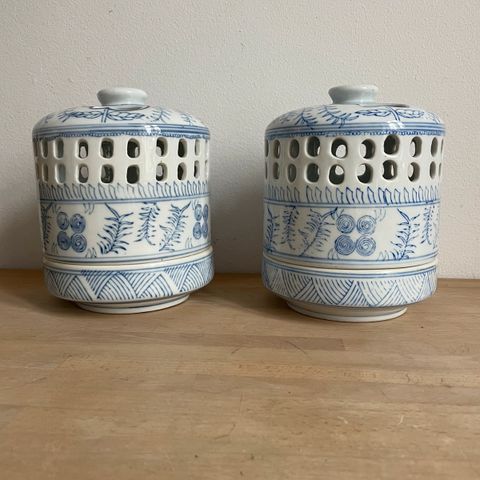 Foto 5-6 ses 3 andre super skønne og dekorative små hvid glaserede keramikhuse med tag = låg - Lågkrukke evt til køkkenet til mandler, krydderier, julegodter mm