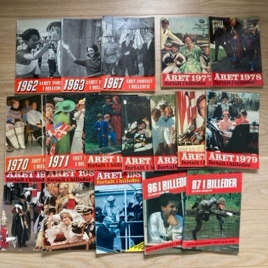 Året fortalt i billeder, årgange: 1953 (brugsspor, mangler bagsiden) 1959 1960 1961 1962 1966 1967 1968 1969 1972 1975 1979 1980 1986 1997 1999 2002 2003 2004 2007 2008 2009 2009 2010 og 2011.