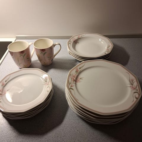 Flad tallerken d 24,5 cm, 6 stk tilgængelig, prisen 40 kr pr stk.