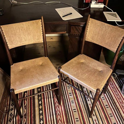 Antikke stole, god stand, men den ene stol har lidt slid i skindet (ægte koskind) på et mindre område, men der har vi fået skaffet et nyt ægte koskind som medfølger.