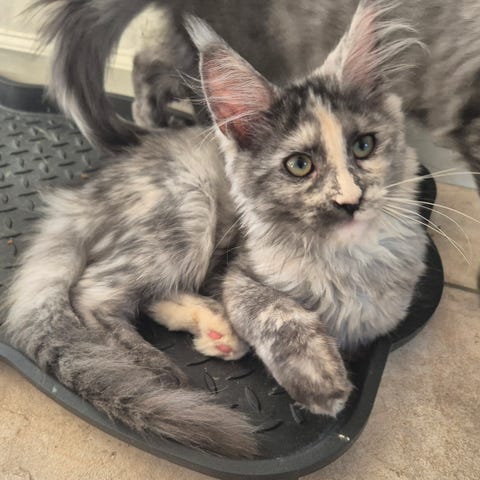 Moren er halvt Maine coon og halvt hellig Birma, så den har en meget lækker og blød pels. Faren er ukendt.
