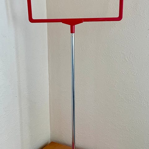 Holder til prisskilte med metalfod. Rammen er af plast. Kan reguleres til 1 meter i højde. Laveste højde 75 cm. Størrelse på bund: 20 x 16 cm. Størrelse på ramme: 30x 42 cm. 3 stk haves