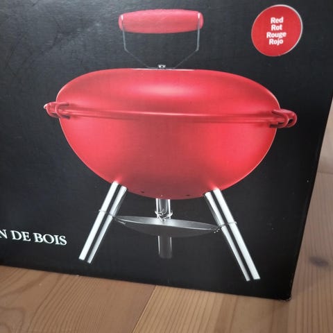 Kuglegrill, Bodum, Grøn med rødt gummihåndtag og røde gummibeslag.