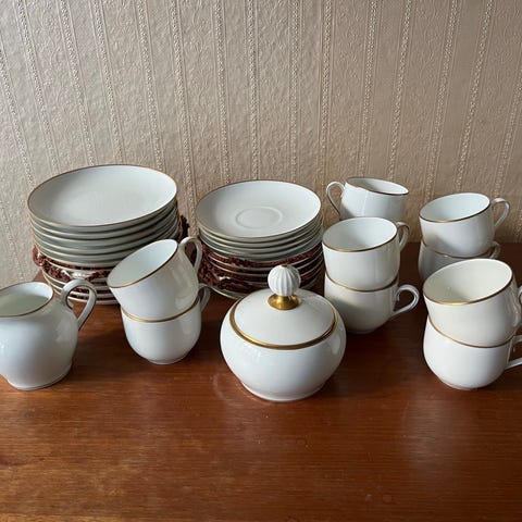 Bing & Grøndahl kaffesæt i hvid porcelæn. Sættet indeholder 13 kopper, 12 underkopper, 11 sidetallerkener, 1 sukkerskål og 1 flødekande. Ideelt til servering ved kaffeborde og formelle anledninger. Fremstillet i Danmark, kendt for sin høje kvalitet og klassiske design.
