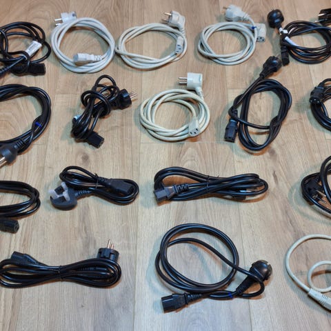 Blandede kabler. Strøm til PC, HDMI, coax, netværk, hdmi switche, ladekabler mm.
