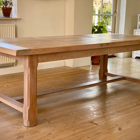 Spisebord, langbord, b: 75 l: 220, Langbord i klassisk fransk, minimalistisk stil med skuffe i ene ende. Har været brugt som udstillingsbord.