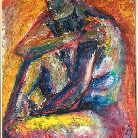 Motiv: ung kvinde i BH og trusser, samt ældre mand siddende på fortorvet i bare fødder.