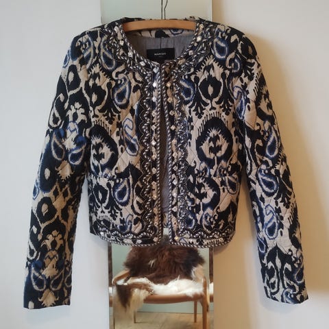 Super fin vintage Mondi denim jakke, den har flot guld broderi, guld knapper og skulderpuder (kan nemt fjernes, hvis det ønskes). Ca. længde 45 cm bredde fra armhule til armhule 52 cm.