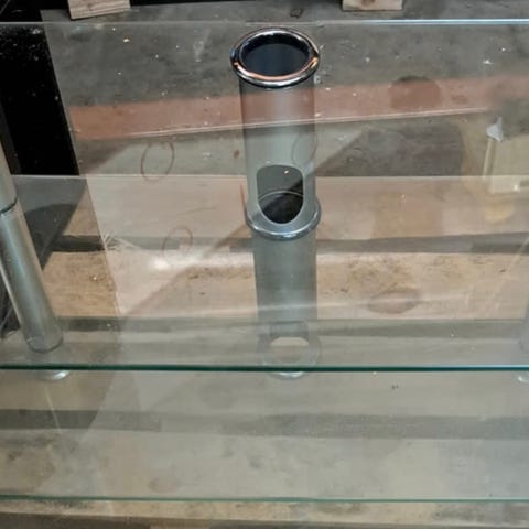 TV-bord i glas. 3 hylder. Den øverste til TV apparatet. Skrå hjørner bagtil.