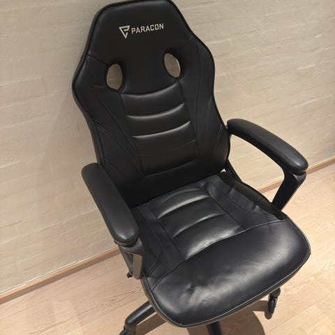 Gamer stol af mærket Paracon. I god stand. Nypris 999 kr. Mekanikken der gør, at ryggen ikke læner bagud, når man presser ryglænet bagud virker ikke. Men stolen fejler intet, når man sidder i den. Det er kun hvis man presser ryglænet meget hårdt tilbage, at det ikke bliver i ret position.
