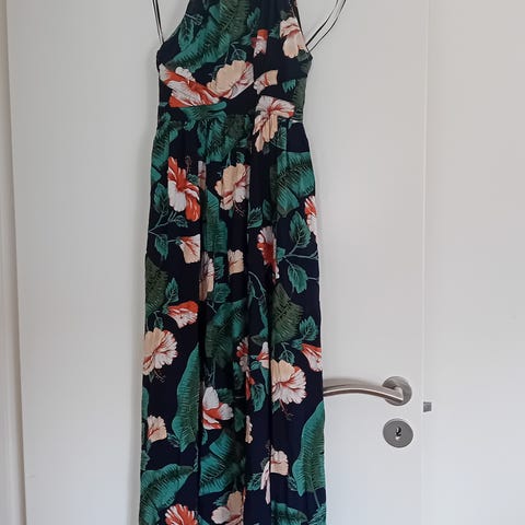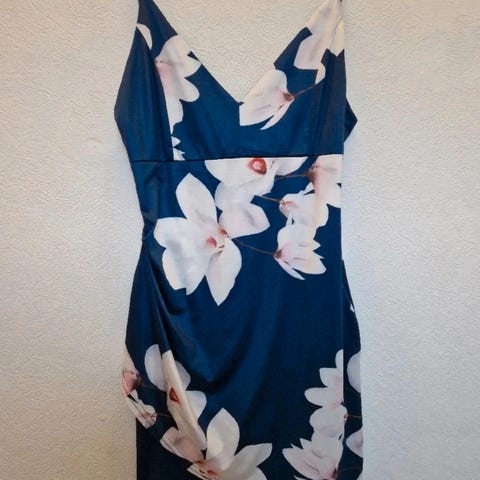 Kort kjole rød med blå blomster. Mærke ”EUROFASHIONS”. Polyester.