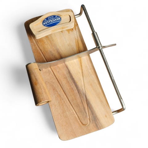 Beskrivelse af oste guillotinen: "Oste-guillotine er et redskab til at skære tynde, lige skiver af Reypenaer ost. Reypenaer er en traditionel hollandsk ost, der modnes i gamle ostelagre. Den har en nøddeagtig, dyb smag med antydning af karamel og er kendt for sin unikke smagsprofil".