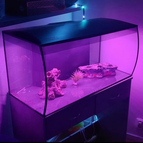 Akvarium med tilhørende kabinet. Akvariet er udstyret med et Eheim filter, som er vist på billedet. Målene er: