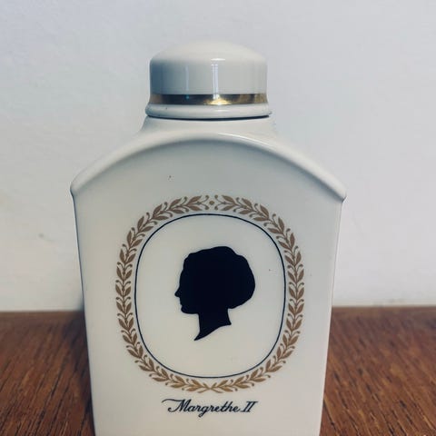 Tedåse med låg af Royal Copenhagen med motiver af Dronning Margrethe d. 2 og Enkedronning Juliane Marie.