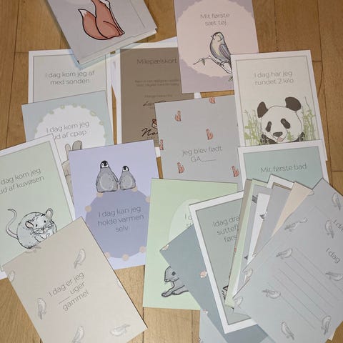 12 Stk. NYE skrivbare Milepælskort for den nyfødte baby og op til første fødselsdag. Kortene er unisex og der kan skrives på begge sider af kortene.