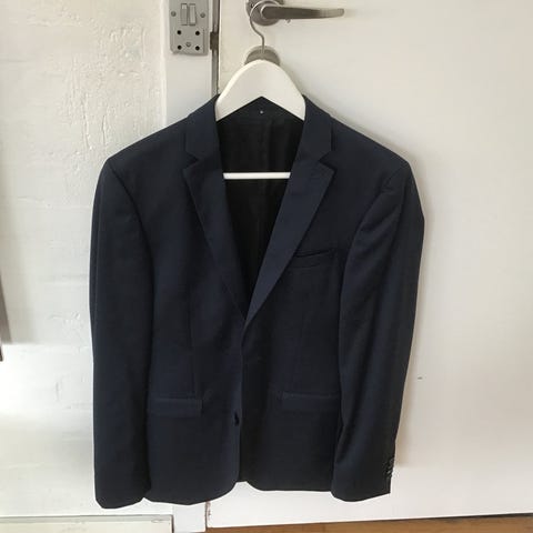 Et meget fint nålestribet jakkesæt med bukser, jakke og vest. Perfekt til hvis man skal have en lille fyr med til nytårsaften eller anden formel lejlighed.