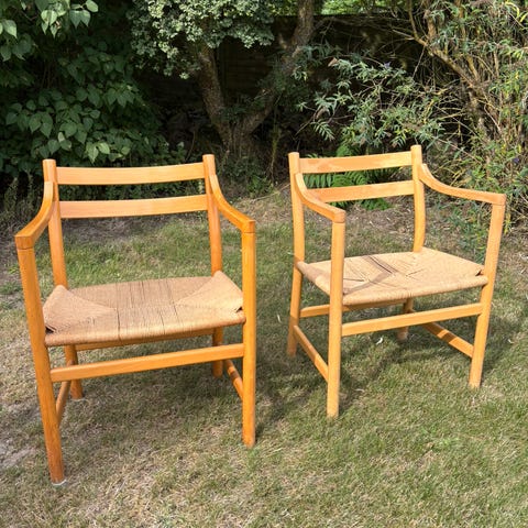 Sæt af to Hans Wegner CH-46 armstole i lakeret bøg og med papirsnor sæder. Stolene er fra 1970'erne og fremstår i god stand, dog med enkelte pletter på sæderne og med enkelte mærker og ridser i stellet.