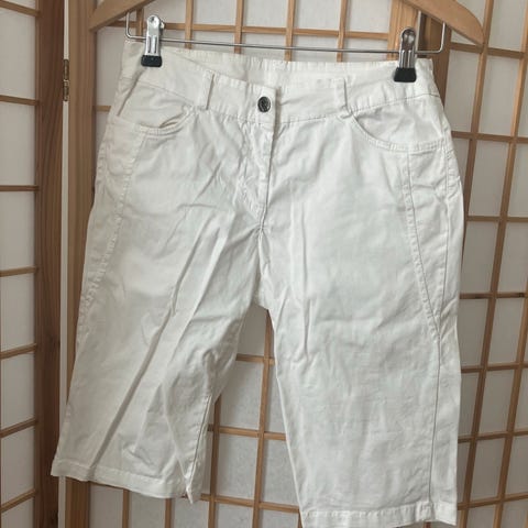Hvide shorts til kvinder i størrelse M. Materialet er jeans. Shortsene har lommer foran og bagpå, samt bæltestropper ved taljen.