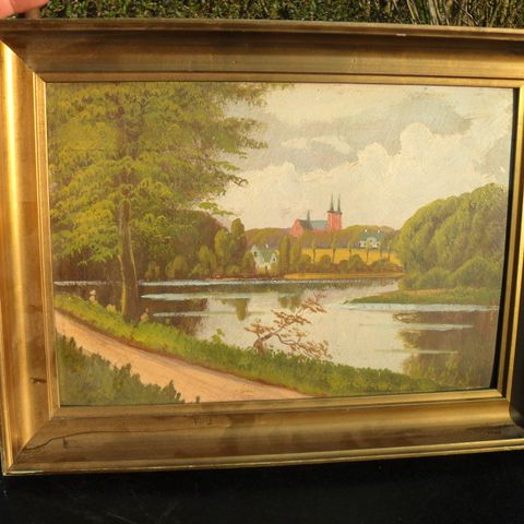 Oliemaleri med landskab i Flot Guldramme B. 78 cm x H. 58 cm. Ramme 7,5 cm bred.
