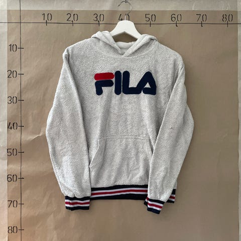 Denne Mørkeblå Hoodie Fra Fila Har Et Tyk, Bamselignende Fleece-Ydre, Der Gør Den Perfekt Til Kolde Dage. Det Store Broderede Logo På Brystet Skaber Et Markant Udtryk, Og De Strikkede Ribbede Kanter Med Røde Og Hvide Striber Giver Den Et Retroinspireret Sportslook. Modellen Har En Afslappet Pasform Og Kængurulomme Foran.