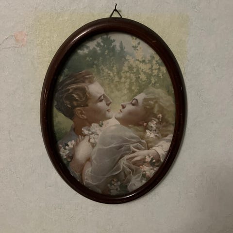 Charmerende lille retro billede med eventyr motiv, længde ca. 16 cm., bredde ca. 12 cm. - med intakt glasplade - fremstår i pæn brugt stand.