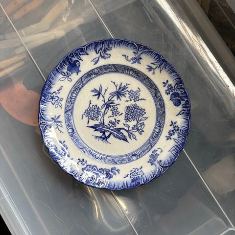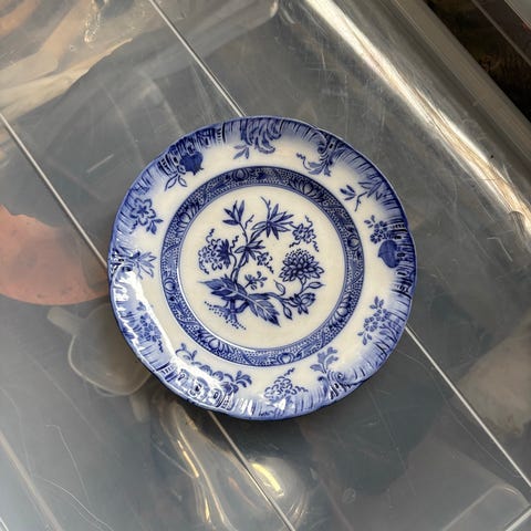 Flad tallerken med blågrå mønster med blomster. Bagpå står der "Villeroy&Boch, Aster, Wallefrangen". Der er også et stort R og i porcelænet er trykket Edo 3½.