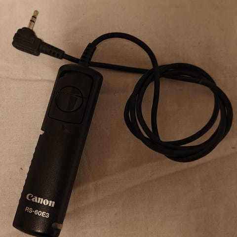 Fjernbetjening Canon, Canon, RS60-E3, Perfekt, Fjernbetjening til Canon spejlreflekskamera. Har været brugt sammen med et analogt EOS500. Udløserknappen kan låses, så man selv kan bestemme de lange eksponeringstider uden at kameraet rystes som det sker, hvis udløseren på selve kameraet nedtrykkes og holdes til eksponeringen er slut.