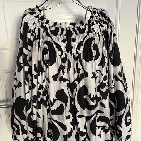 Kjolen har lange ærmer, slids fortil og bindebælte.