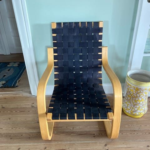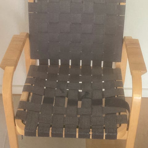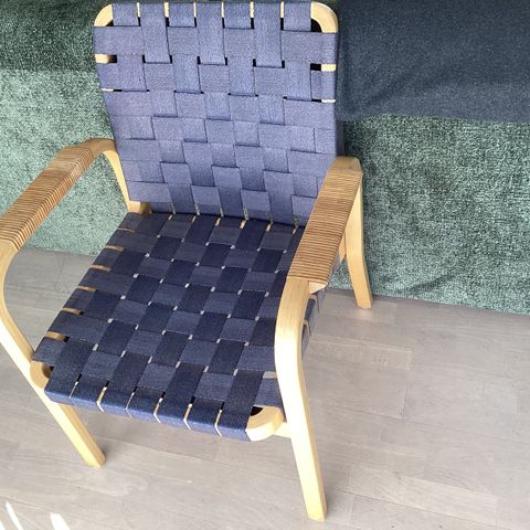 2 flotte armstole, som ligner Artek 45 stolene, der er designet af Alvar Aalto i 1947, men det kan være en efterligning, da siddehøjden er 41 cm og ikke 43 cm. Desuden er stolene en smule lavere i højden (se sidste billede, hvor én af stolene står op af en ægte Artek 45!) Stellet er i formbøjet birketræ og sæde og ryg i lyst kanvas. Armlænene er beviklet med bambusflet. Højde ca. 80 cm, Bredde 60 cm og siddehøjden er 41 cm. Stolene fremstår med slid i bambusflettet, samt mindre pletter i kanvasen, men er ellers i fin stand.