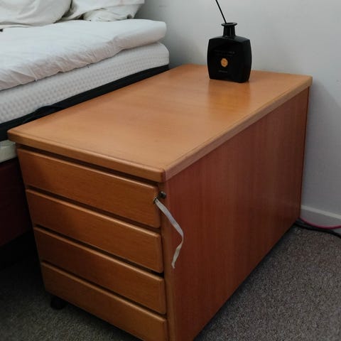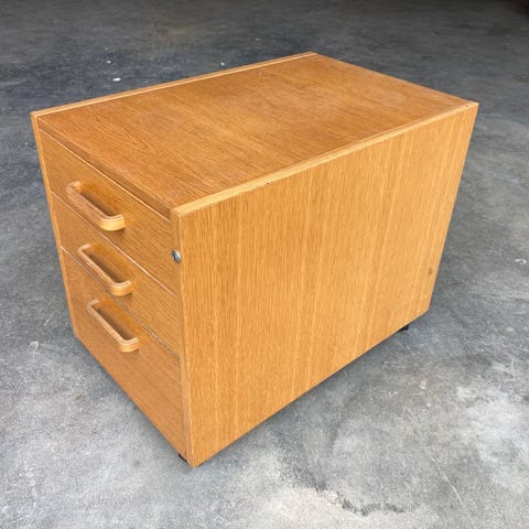 Fint skuffemodel til praktisk opbevaring under skrivebordet. Modulet er med 3 skuffer i forskellige størrelser. Øverste skuffe med praktisk bakke til opbevaring af småting, og nederste med opbevaringsbakke til papirer/dokumenter osv. Skuffemodulets forreste hjul kan låses, så modulet ikke triller, når man åbner skufferne. Nøgle til aflåsning af skufferne medfølger. Skuffemodulets mål er flg.: H: 60, B: 42 og D: 59 cm. Modulet fremstår med brugsspor, såsom mindre kanthak, samt skrammer/ridser i træet nogle steder.