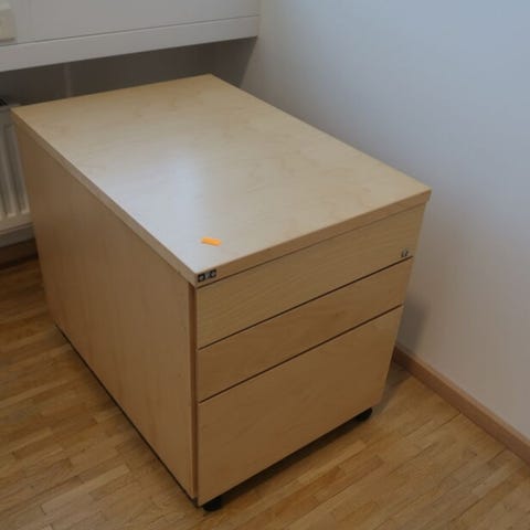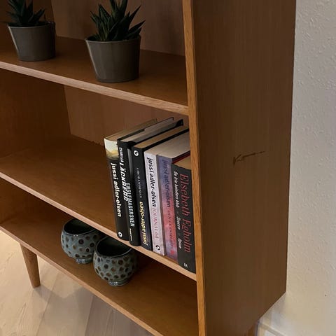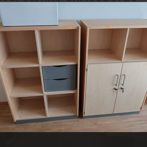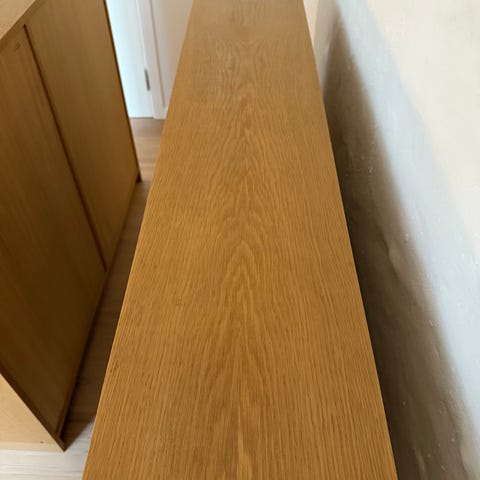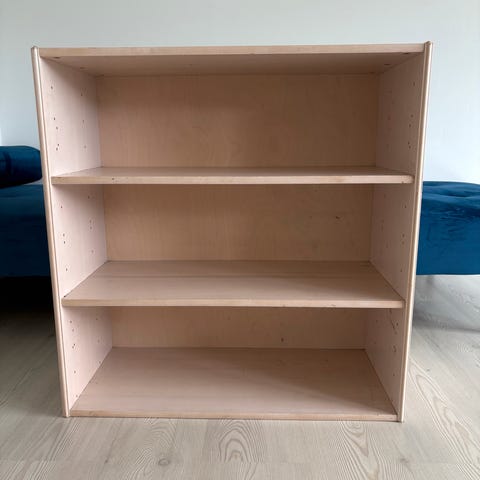 EFG reol på sokkel i ahorn træ. Mål: Højde 107,5 cm, Bredde 90 cm og Dybde 44 cm. Reolen er med 2 flytbare hylder. Den har også en pæn bagside/beklædning, hvis reolen skal stå frit og ikke op af en væg. Reolen er i pæn stand, med mindre brugsspor.