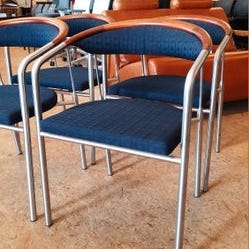 Super smuk design stol fra firmaet Hansen & Sørensen. Stolen er designet af arkitekten Henrik Tengler. Armstolen er med et stel af børstet stol og lakeret bøgetræ. Sæde og ryg er betrukket med grønt stof. Stolene er med almindelige brugsspor, såsom småridser i stel og små hak i træet nogle steder, desuden er nogle af afstandsstykkerne mellem sæde og stel limet/tapet – se billede. Stolenes mål er: bredde 55, dybde 50, højde 76 og siddehøjden er 45 cm. Lagerbestand: 4 stk.