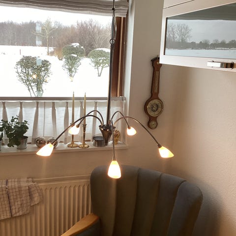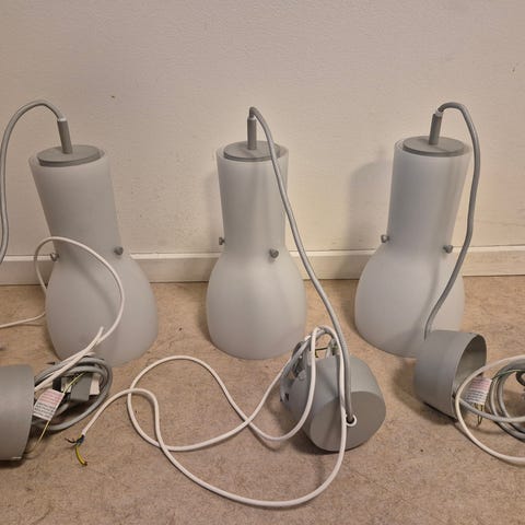 Sælger disse tre loftslamper som har være monteret på en loftskinne. De giver et super flot lys over spisebord eller køkkenbord.