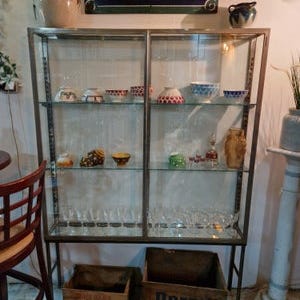 Meget stort og tungt fransk vitrineskab i krom, fra omkring 1930'erne. Kommer fra en bar eller butik.