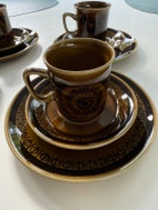 4 sæt retro kaffekopper med underkopper og kagetallerkener fra Norge, Stavangerflint mærket Sera. Med fad/tallerken.