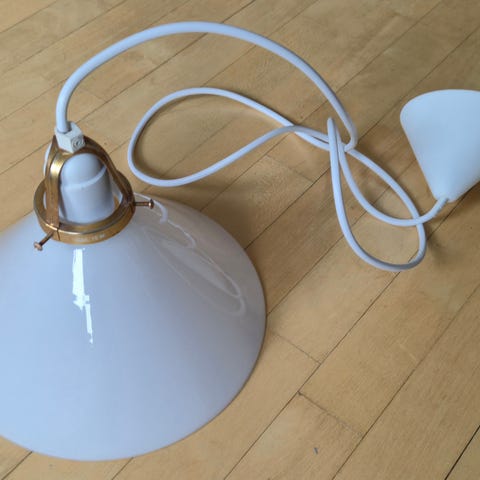 Der er monteret messing skærmholder, messing/porcelæn fatning og 3m hvid snoet stofledning.