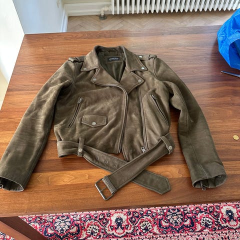St-Martins læderjakke, der står XL i den, men det må være en fejl, da den slet ikke er særlig stor, det er nærmere en størrelse small. Lavet i krøl, med elastik i ærmerne, og med knap lukning. Højst brugt 1-2 gange, ellers bare hængt i skabet, rigtig fed læder jakke.