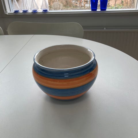 I toppen er skålen lidt skæv i den øverste kant. Noget der retter sig ud hvis der sættes urtepotte i.