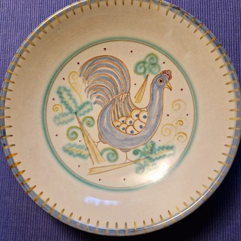 Stor, flot frugtskål fra Hjorth, Bornholm. Skålen kan bruges til mange formål: frugt, blomster el. lign. Der er nogle få brune pletter indvendigt, men ellers er den i meget fin stand. Højde: ca. 16 cm, Ø 25 cm.