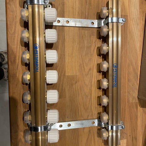 Gulvvarme, Pettinaroli, Nye og ubrugte dele og fittings i original indpakning til bl.a. Alpha gulvvarmesystemet. Jeg har 1 X 2 stk. Pettinaroli Komplet afslutningsstykker til fordelersystem bestående af påfyldnings-/aftapshane og luftudlader. Sælges for ½ pris dvs. 100 kr. pr. stk. Derudover har jeg 1 X 2 Pettinaroli Kuglebundstophaner med slangeforskruning og slutmuffe Basis: 1/2” nippel x 1/2” nippel. Forskruning: 14,5 mm. Muffe: 1/2” - sælges ligeledes til ½ pris